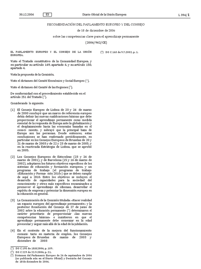 Recomendación 2006/962/CE del Parlamento Europeo y del Consejo, de 18 de diciembre de 2006, sobre las competencias clave para el aprendizaje permanente (DO L 394 de 30.12.2006, pp. 10-18) última actualización 10.10.2016
