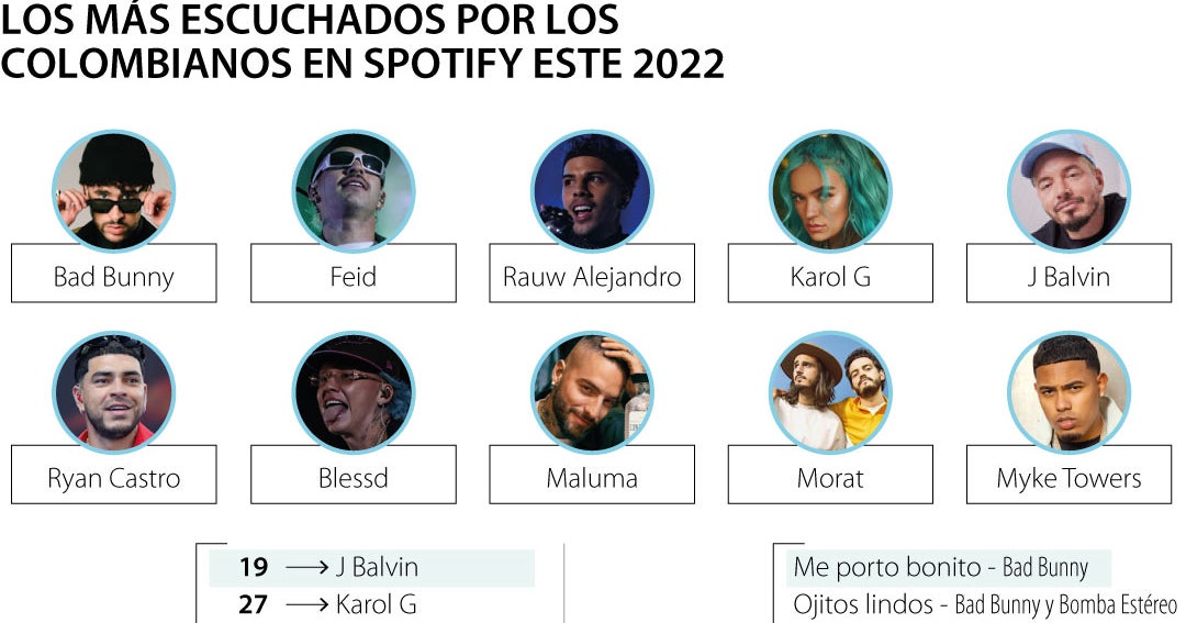 Nueve de los 10 artistas más escuchados en Colombia durante 2022 cantan