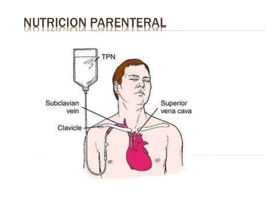 Complicaciones en la nutrición parenteral. INTRODUCCIÓN. La nutrición parenteral es un sistema de administración de nutrientes al paciente a través de una vía central; es la única vía de nutrición para el paciente que presente colitis ulcerosa, obstrucción intestinal, y trastornos intestinales. En las fórmulas se mezclan glúcidos.