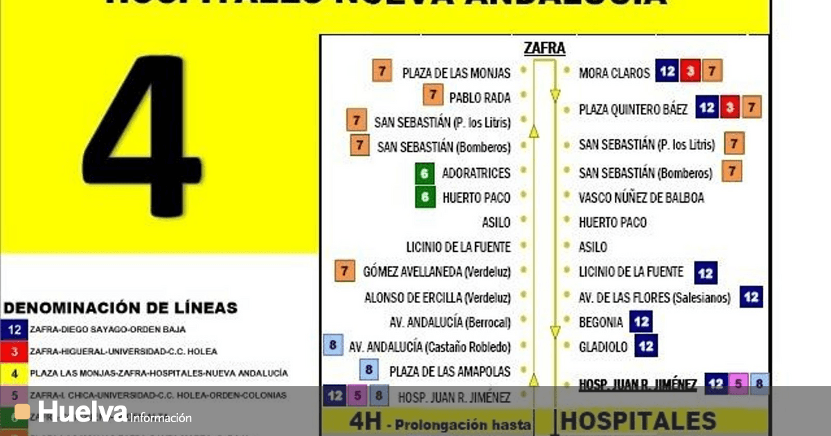 La Empresa Municipal de Transporte Urbano, Emtusa, prolongará sus horarios de servicio de cara a la Semana Santa de Huelva.Lo hará, de este modo, hasta las 00:00, desde el Domingo de Ramos al Viernes Santo, ambos inclusive, realizando salidas hacia las barriadas desde la parada central de Zafra para las Líneas 1, 2 y 8 y salidas desde la rotonda Dinastía Los Litri para Línea 7, con los.