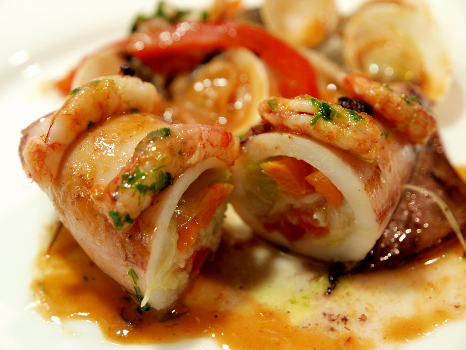 LA CUCHARA CURIOSA CALAMARES RELLENOS DE GAMBAS CON SALSA DE ZANAHORIA PICANTE