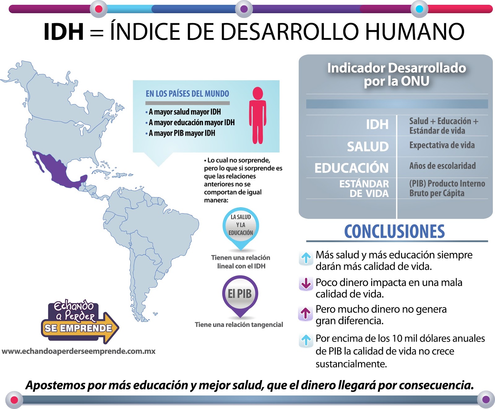 El índice de desarrollo humano (IDH) es un indicador del desarrollo humano elaborado por las Naciones Unidas para medir el progreso de un país. A diferencia de los indicadores anteriores, que medían el desarrollo económico de un país, el IDH analiza la salud, la educación e ingresos. Salud (esperanza de vida al nacer): La esperanza de.
