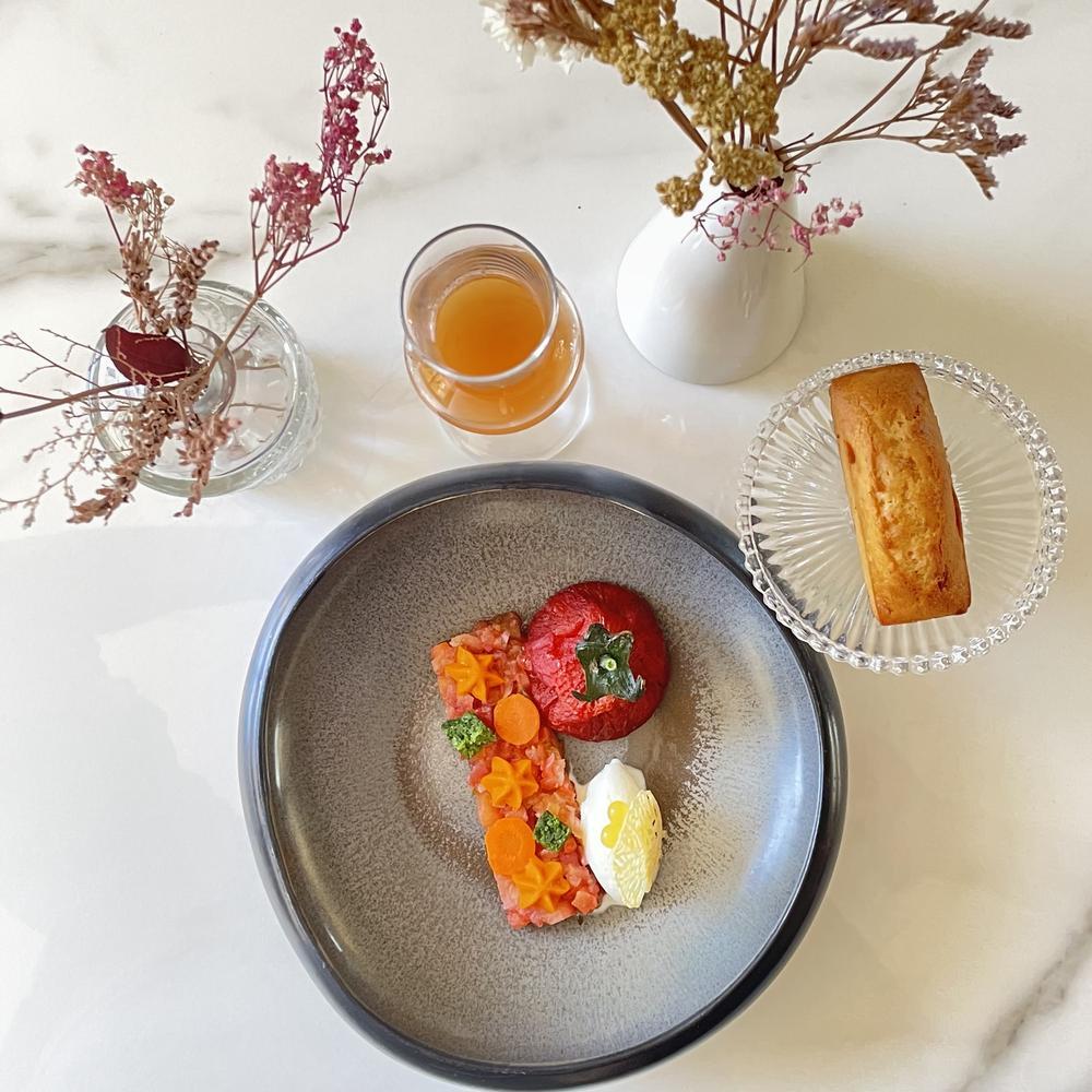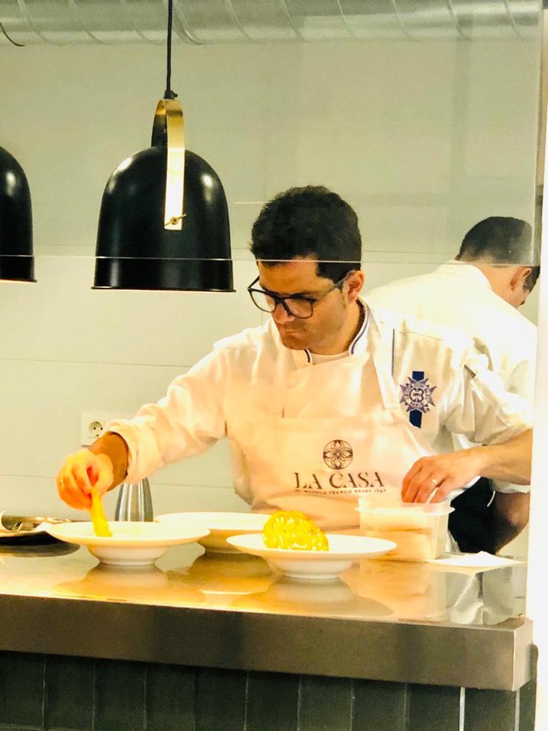 Uno de los pases que más nos gustaron en La Casa de Manolo Franco. El aperitivo, compuesto de otras 4 elaboraciones: una original versión de la Tortilla española, Bombón de picantón, pichón, vermú y piñones, Croqueta ibérica de la abuela Pepa y Buñuelo queso de Fresnedillas, ajo escalivado y membrillo. Difícil elegir uno, había.