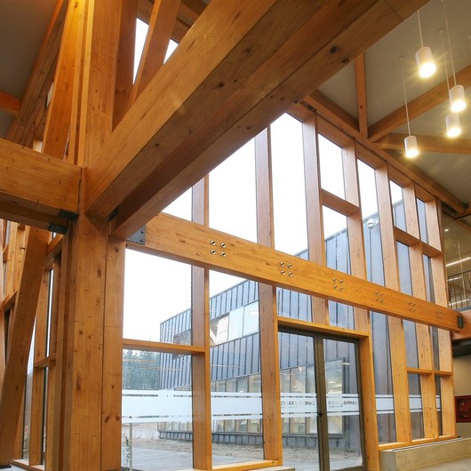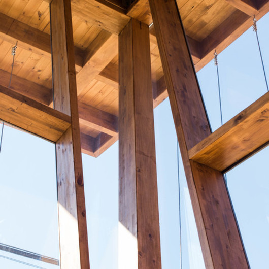 Muro cortina con vigas estructurales de madera laminada de roble