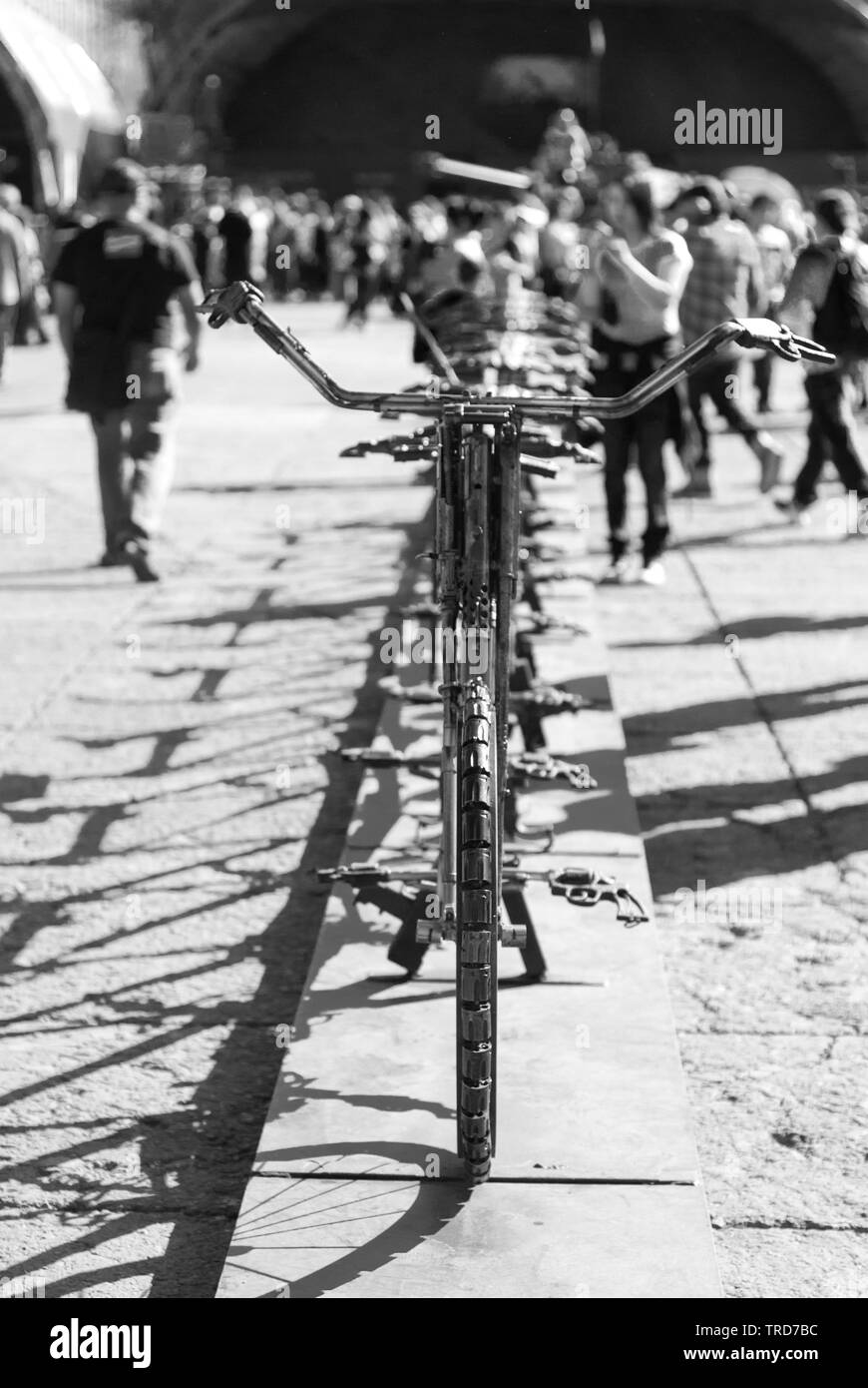 Escultura realizada en bicicleta reciclada pistolas en blanco y negro, CDMX expo Fotografía de