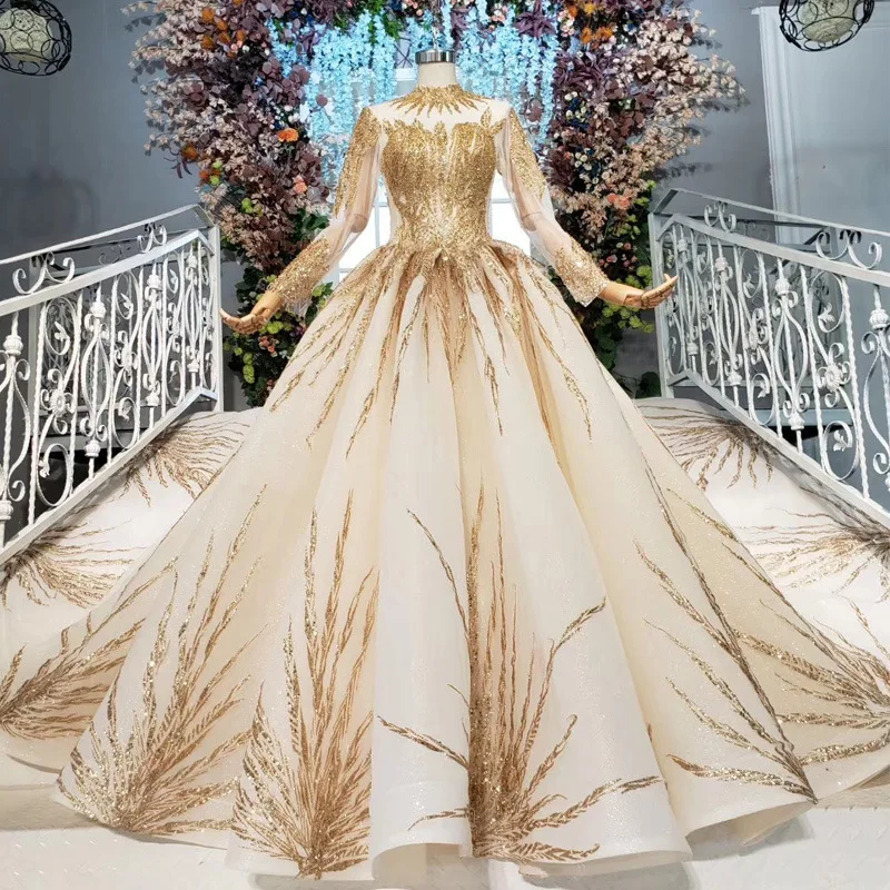 Vestidos de Novia con Apliques en Blanco y Dorado para Novia con Mangas largas